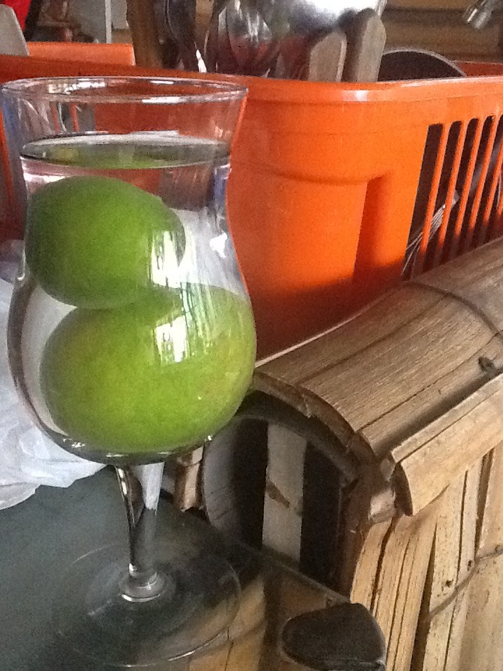 For the past three days I had been looking at this glass filled with limes submerged in water. I wondered often about them. This morning I finally asked.