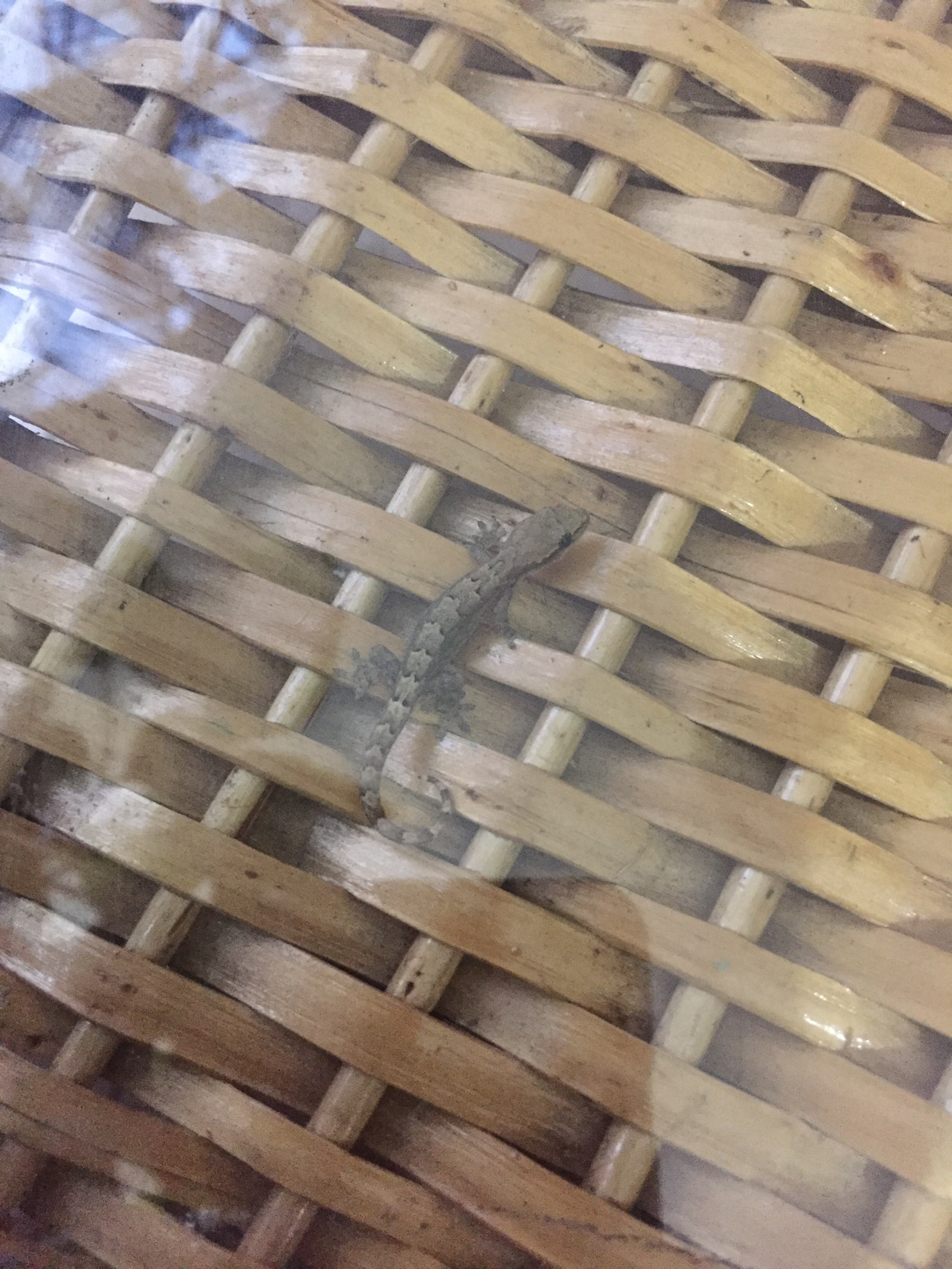 This little guy is so tiny he can actually walk around underneath the glass top of this wicker outdoor table.